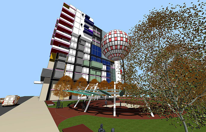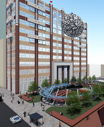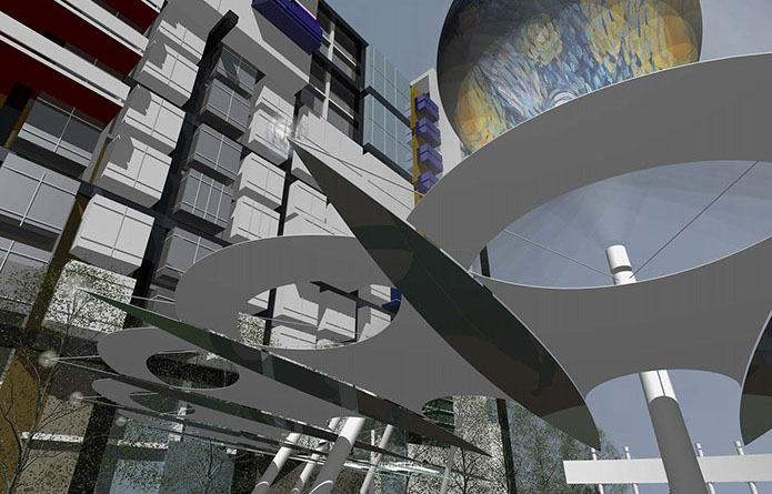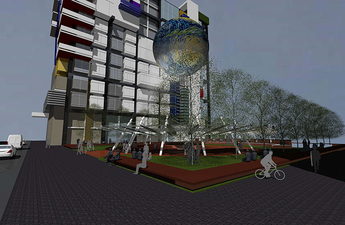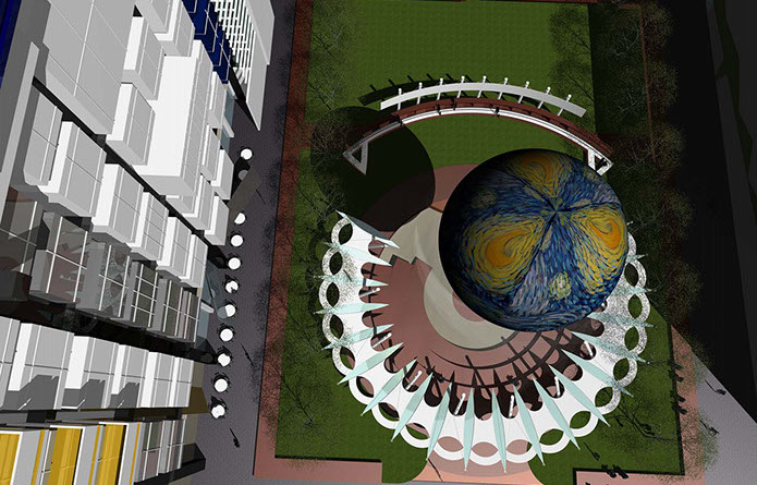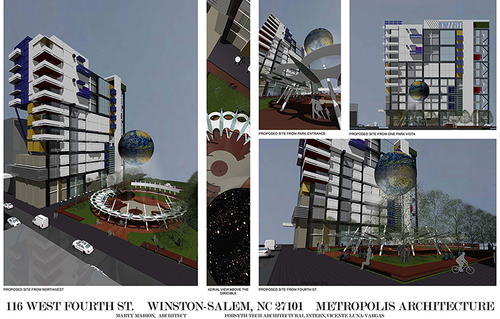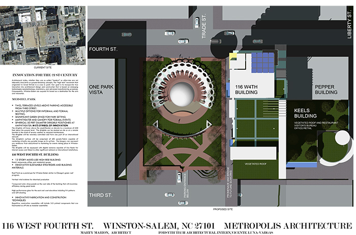 Features for the park and multi-use 116 W 4th Street building include two, terraced levels with outdoor dining, parking accessible from third street, multiple options for informal and formal seating, significant green space for the park and amphitheater – canopy. The park’s most recognizable feature is a 50 feet diameter dirigible hovering above the amphitheater. The dirigible’s surface is a digital display screen capable of unlimited graphic and animated productions. Visible, from Business 40 and throughout the city, the dirigible will be Winston-Salem's most visible symbol that signifies our role as a true city of innovation.