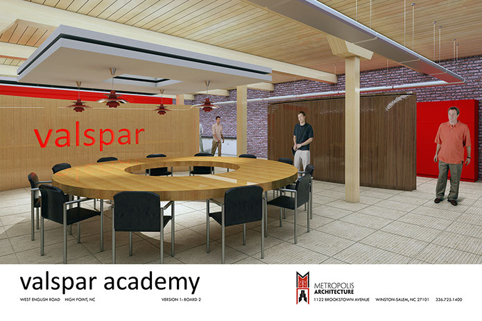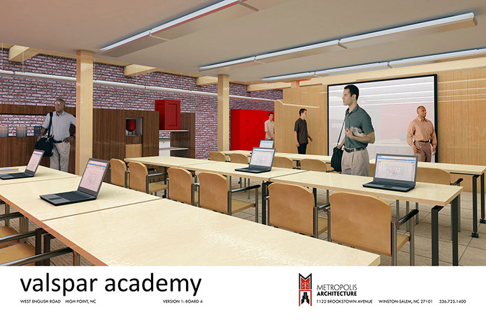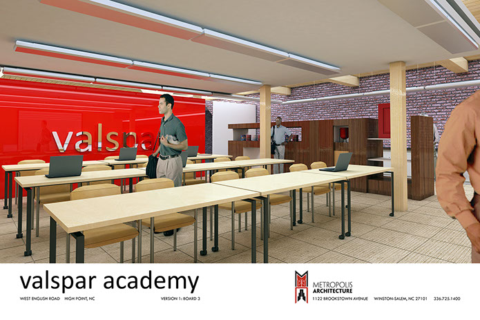 Valspar Academy is located at the Valspar Wood Coating facility near the International Furniture Market in High Point. The academy was designed as a “hands-on” educational and training center for the largest distributors of Valspar Wood Coatings in the southeast region.