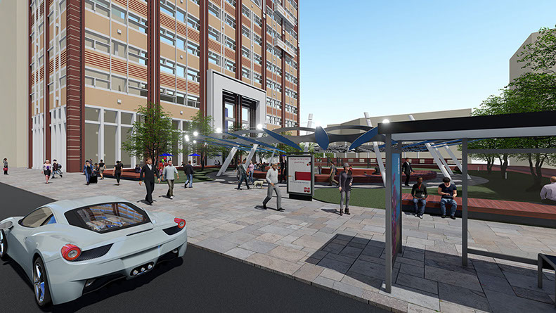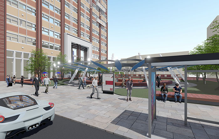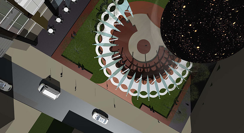 Features for the park and multi-use 116 W 4th Street building include two, terraced levels with outdoor dining, parking accessible from third street, multiple options for informal and formal seating, significant green space for the park and amphitheater – canopy. The park’s most recognizable feature is a 50 feet diameter dirigible hovering above the amphitheater. The dirigible’s surface is a digital display screen capable of unlimited graphic and animated productions. Visible, from Business 40 and throughout the city, the dirigible will be Winston-Salem's most visible symbol that signifies our role as a true city of innovation.